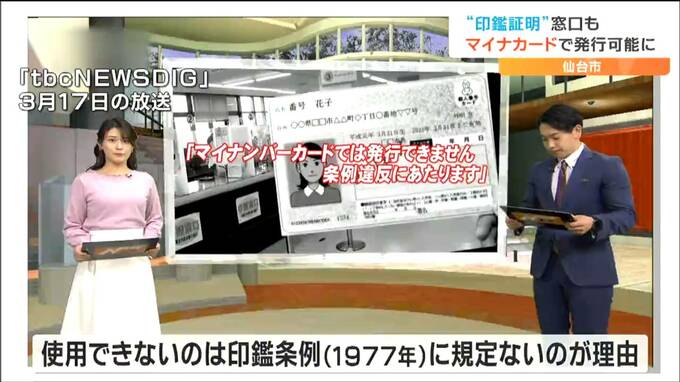 自動車の購入や不動産登記などに必要な「印鑑登録証明書」。仙台市では、取得する際、コンビニなどのマルチコピー機ではマイナンバーカードを使える一方、窓口では使うことができず、市民から改善を求める声が上がっていました。