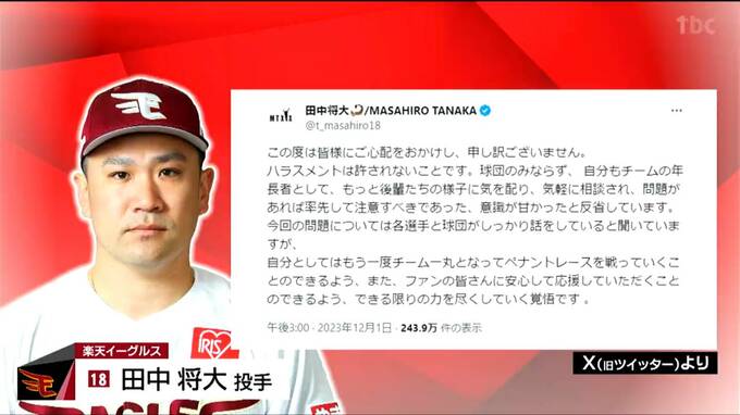 楽天イーグルスの田中将大投手が、安樂智大投手のパワハラ問題を受け、自身のX(旧Twitter)で「問題があれば率先して注意すべきであった」とコメントしました。