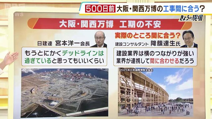 ――工期について、日建連の宮本洋一会長は、「もうとにかくデッドラインは過ぎていると思ってもいいくらい」と強い危機感を示しています。実際のところ間に合うのか、建設コンサルタントの降籏達生さんに聞きますと、「建設業界は横の繋がりが強い。業界が連携して間に合わせるだろう」と見ています。開催まで500日を切りました。このように、両方の意見があるというのが現状のようです。(2023年11月30日放送 MBSテレビ「よんチャンTV」より)