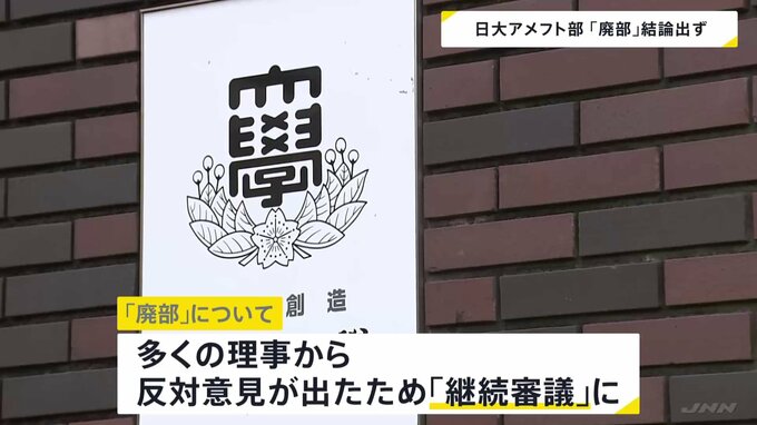 日本大学はきょう、アメフト部の「廃部」の方針について理事会で話し合いましたが、結論が出ず、「継続審議」となりました。日大アメフト部をめぐっては、これまでに違法薬物事件で逮捕者が3人出ていて、きのう新…