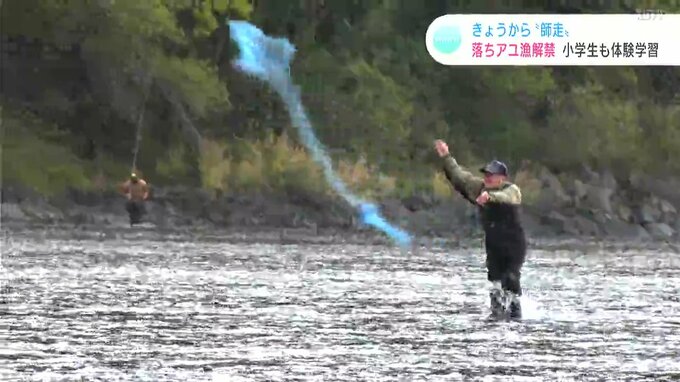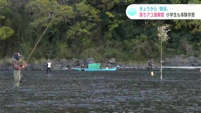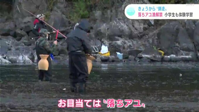 落ちアユ漁の解禁に合わせ、故郷の誇りを知る総合学習の一環で中村南小学校の4年生42人が四万十川を訪れました。子どもたちは市役所の職員からオスとメスの違いや漁ではいろいろな種類の網や竿を使うことなどを教わりました。また、川漁師の協力を得て、実際に網にかかったアユを取り外す作業を体験しました。