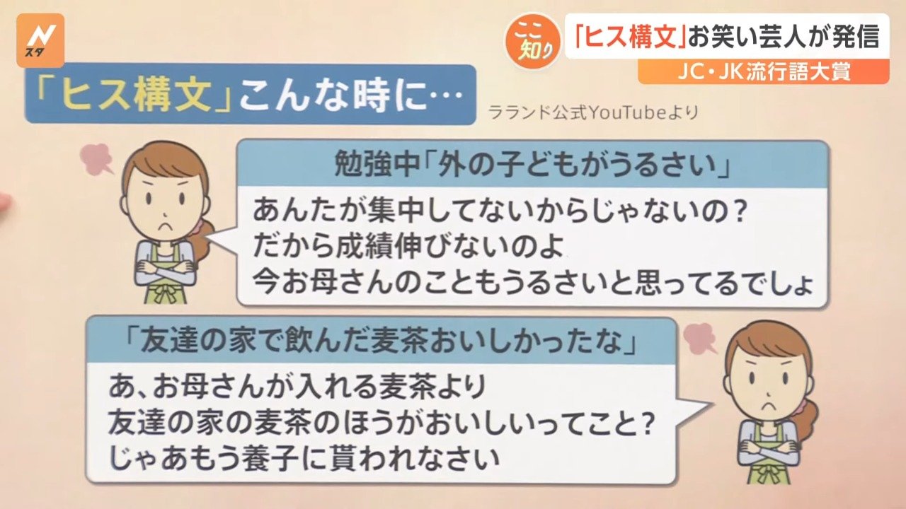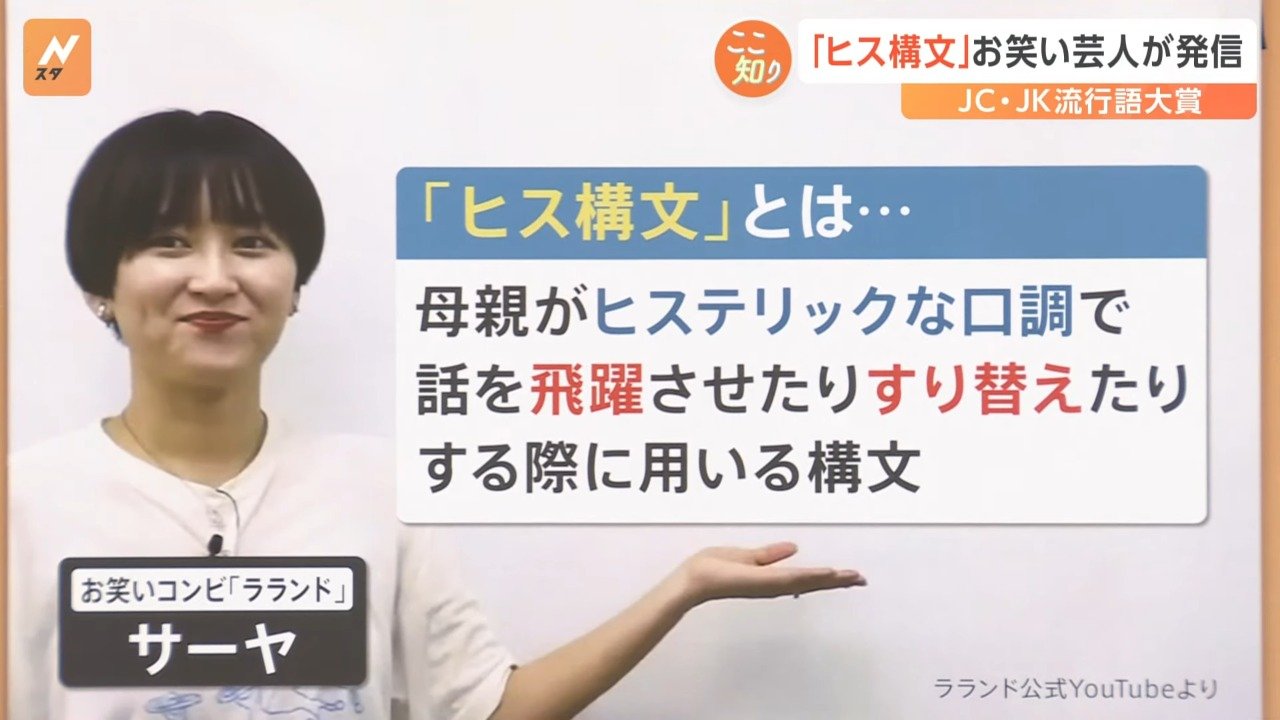 続いて、2位だったのが「ヒス構文」。お笑いコンビ「ラランド」サーヤさん発案です。「ヒス構文」=母親がヒステリックな口調で話を飛躍させたり、すり替えたりする際に用いる構文。