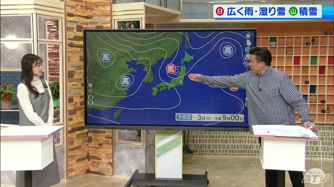 3日(日)なんですけども低気圧が進んできて、東北地方を通りますから、天気が崩れるんですね。ただ平地の方ではどうやら、限りなく雨に近い湿り雪だったり、雨が降るという状況になりそうです。午前中は何とか天気持つかもしれませんけども、午後になってくると天気が崩れてくるという状況になっています。今のところ平地の方では雨ということになりそう。路面状況がさらに悪化しそうなのでご注意ください。