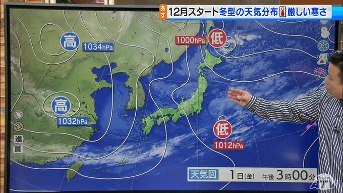 12月2日は冬型の気圧配置が緩んできます。まだ雪を降らせる寒気が、ところどころ残ってる状況です。ですので1日よりも雪の降るエリアは狭まってくるという状況で、今のところ大雪の心配はなさそうだという状況なんですよね。ただですね、寒さは厳しいです。2日も1日と同じぐらいの場所によっては年末年始並みの寒さのところがありますので、暖かくしてお過ごしください。