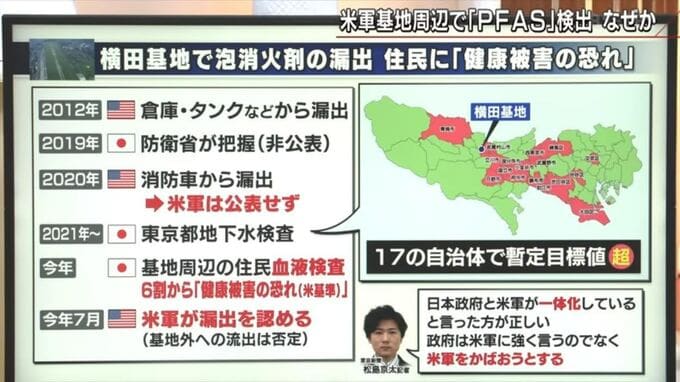 「調査がされていない」と長妻議員が言う日本。実際PFASはどうなっているのか…PFASが使われているもので代表的なものの一つは泡消火剤。米軍や自衛隊で使用しているケースが目立つ。東京都が横田基地周辺を調査したところ、基地から東京湾にかけて土壌の汚染程度が濃いことが分かった。2012年には米軍基地内で泡消火剤が漏出していたのだが2019年には防衛省はその事実を知っていた。しかし非公表。米軍と公表についてすり合わせをしていたが、回答があった後も伏せていたのだ。公表されたのはようやく今年になってからだった。