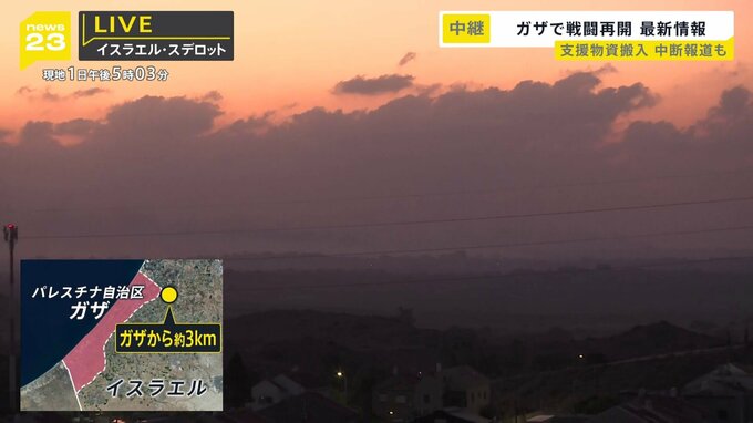 イスラエルには城島記者がいます。戦闘が再開されたガザは今、どんな状況でしょうか?ここはガザの境界まで3キロほどの場所で、私の背後にガザ北部の街が広がっています。戦闘が再開してから10時間ほどが経過しまし…