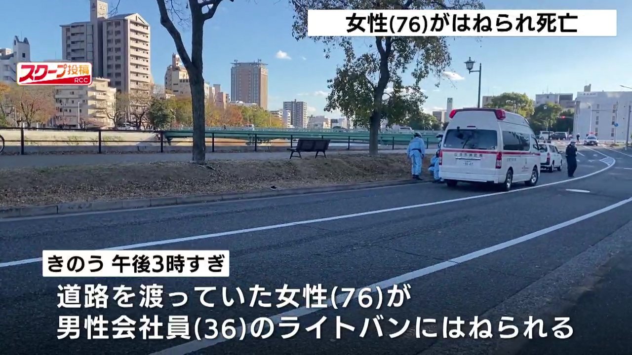 事故があったのは、広島市西区上天満町の天満川沿いの市道です。2日午後3時すぎ、道路を渡っていた76歳の女性が、36歳の男性会社員が運転するライトバンにはねられました。