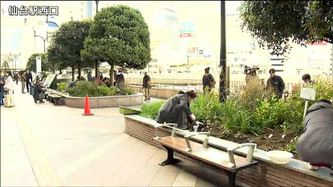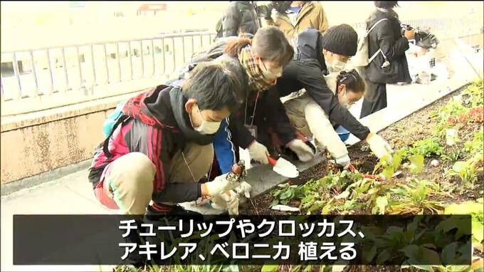 仙台駅西口のペデストリアンデッキで行われた花壇の植え替えには、地元の小中学生らが参加しました。