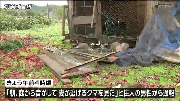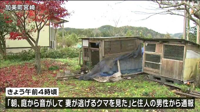 3日未明、宮城県加美町の住宅の敷地内で、クマ1頭が逃げるのが目撃されました。この家ではニワトリ小屋が壊され、ニワトリが死んでいるのが見つかり、警察は、住民に注意を呼びかけています。
