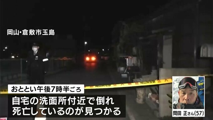 この事件はおととい(2日)午後7時半ごろ、倉敷市玉島の会社経営・問田正さん(57)が自宅1階の洗面所付近で倒れ、死亡しているのが見つかったものです。