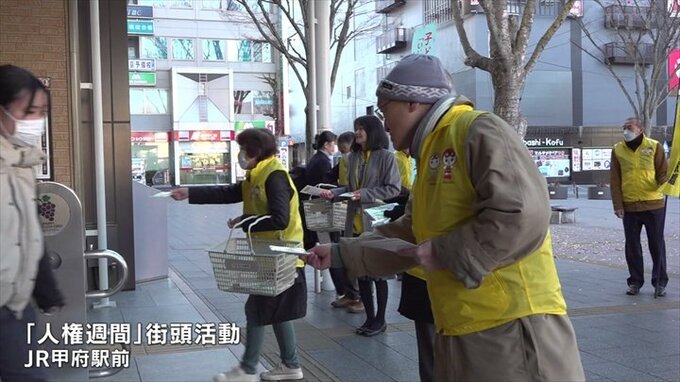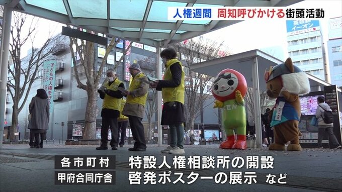 街頭活動には県の人権擁護委員や法務局の職員などおよそ20人が参加しJR甲府駅前でいじめや家庭内暴力などの相談先が書かれたリーフレットやメモ帳など1000セットを配りました。