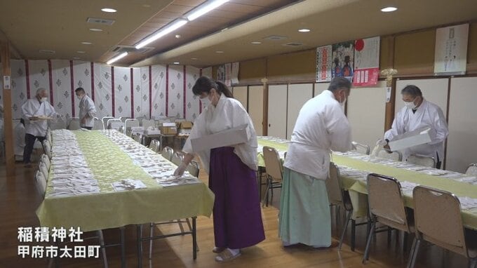 正月の参拝者の受け入れへ向け、甲府市の稲積神社で正月飾りの袋詰めとしめ縄作りが行われました。