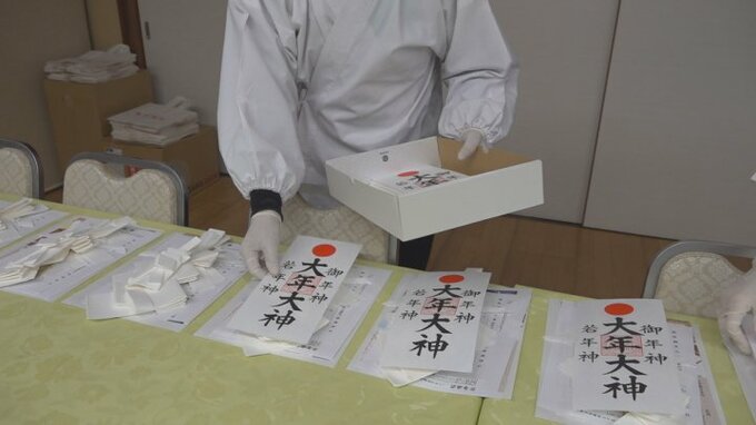 神職らは正月に祀るお札や台所の火除けのお札、それに紙垂や人形といった家の中に飾る正月飾り、あわせて450セットの袋詰め作業を行いました。