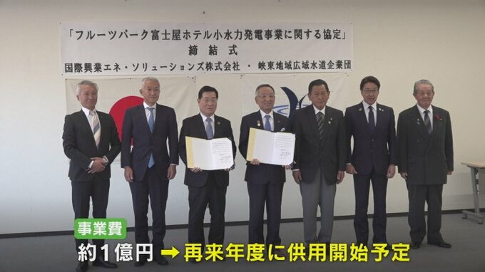 山梨県の峡東地域の水道企業団とフルーツパーク富士屋ホテルのグループ会社が、浄水場に小水力発電機を設置する協定を結びました。