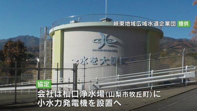協定により会社は、山梨市にある杣口浄水場に小水力発電機を設置します。