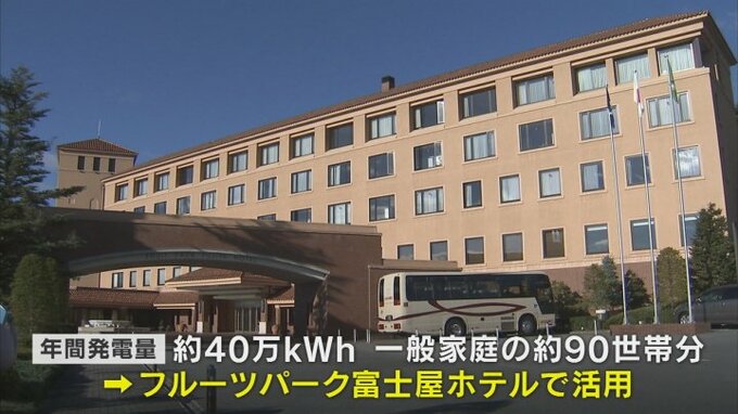 年間の発電量は一般家庭約90世帯分の使用量にあたる約40万kwhで、山梨市のフルーツパーク富士屋ホテルで活用されます。
