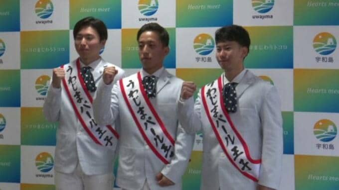 真珠養殖のまち、愛媛県宇和島市をPRする13代目の「パール王子」に3人が選ばれ、市役所で、4日、引継ぎ式が行われました13代目のパール王子に選ばれたのは、団体職員の豊岡恒汰さん、真珠養殖業の中村海輝さん…