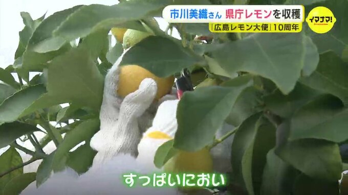 「広島レモン大使」として10周年を迎えたタレントの 市川美織 さんが、広島県庁で育ったレモンを収穫しました。