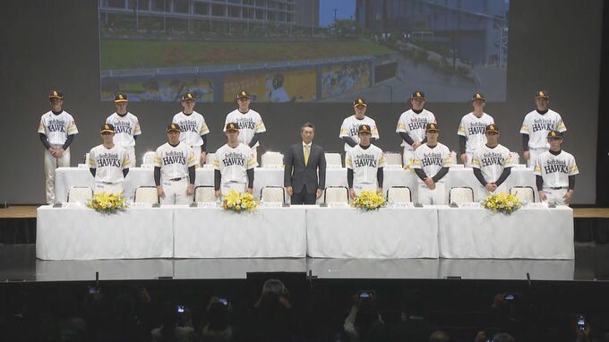 ホークスに入団が決まった新人選手たちの発表会見が4日、行われ、支配下と育成合わせて15人のルーキーが意気込みを語りました。 E・ZOFUKUOKAで行われた新入団選手の発表会見。真新しいユニホームを…