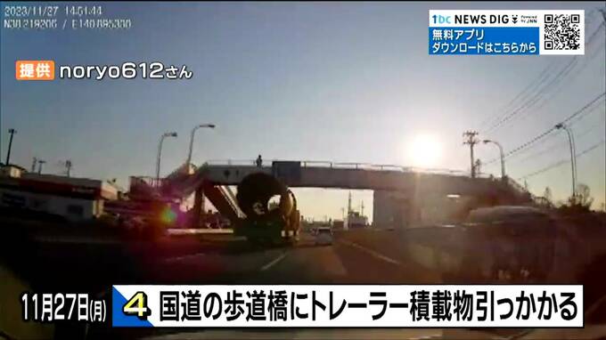 現場を通過した車のドライブレコーダーの映像です。トレーラの積載物が歩道橋に引っかかっていて、それを避けるように車が通過しています。