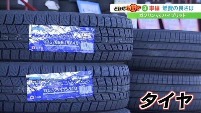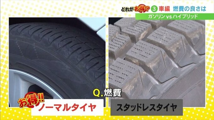 燃費がいいのはノーマルタイヤ。スタッドレスタイヤは摩擦抵抗が大きいので、エンジンのパワーが必要になってくる。そういった面でノーマルタイヤの方が燃費は良い。