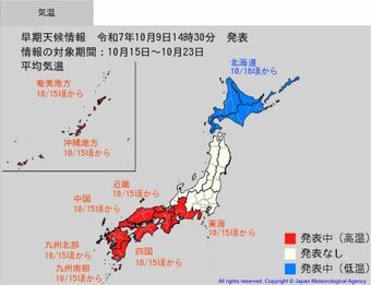 東海、近畿、中国、四国、九州などでは10月15日頃から、この時期としては10年に一度程度しか起きないような「著しい高温」となる可能性 一方、北海道では10月18日頃から、この時期としては10年に一度程度しか起きないような「著しい低温」となる可能性 気象庁が発表