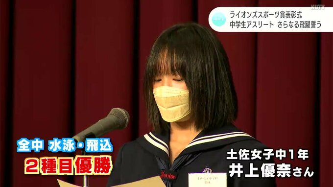 個人では、26人の選手が受賞。全中・水泳の飛込2種目で1年生ながら優勝した土佐女子中学校の井上優奈(いのうえ・ゆな)さんは、「充実した1年だった」と振り返りました。
