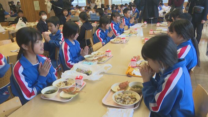 無償で提供された香箱ガニは210杯で、小、中学生およそ140人と教職員が日本海の冬の味覚に舌鼓を打ちました。児童たちは家からカニスプーンやハサミを持参し準備万端でかに給食を満喫していました。