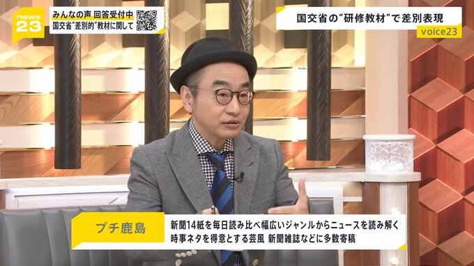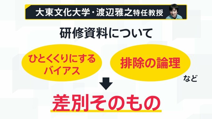 この研修資料について、道徳教育が専門の大東文化大学の渡辺雅之特任教授は、▼ひとくくりにするバイアス・偏見がある。それから、▼排除の論理で、いかに相手を黙らせて納得させて、引き下がらせるかという視点になっている。これは「差別そのもの」であるという指摘でした。