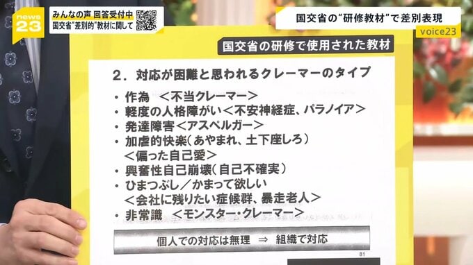 国交省の研修で使用された資料の一部ですが、「対応が困難と思われるクレーマーのタイプ」としてカテゴリー分けされています。研修を担当した会社の社長は「悪いつもりで言ったわけではない。差別意識は持っていなかった」ということなんです。