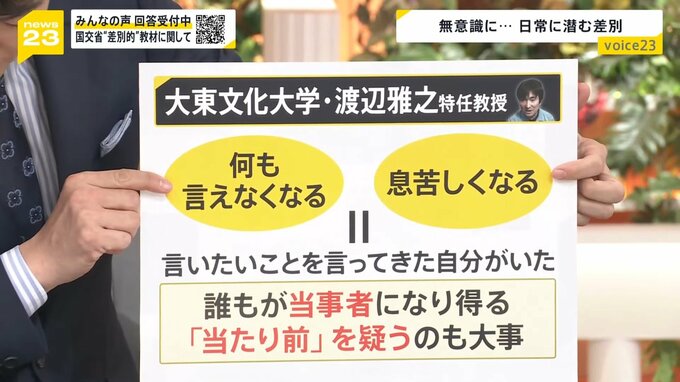 街の声で大学生が答えてましたが、大東文化大学の渡辺雅之特任教授の話では「何も言えなくなる」「息苦しくなる」というのは、▼言いたいことを言ってきた自分がいた。誰もが当事者になり得るので、▼「当たり前」を疑うのも大事なのではないか、というメッセージです。