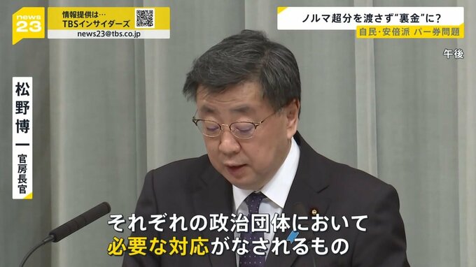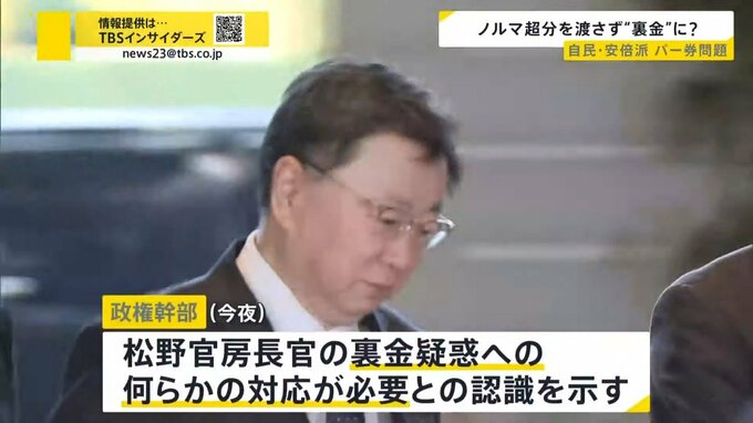 政権幹部は5日夜、「そろそろ何とかしないと」と述べ、裏金疑惑について、安倍派の事務総長を務めていた松野官房長官の何らかの対応が必要との認識を示しました。