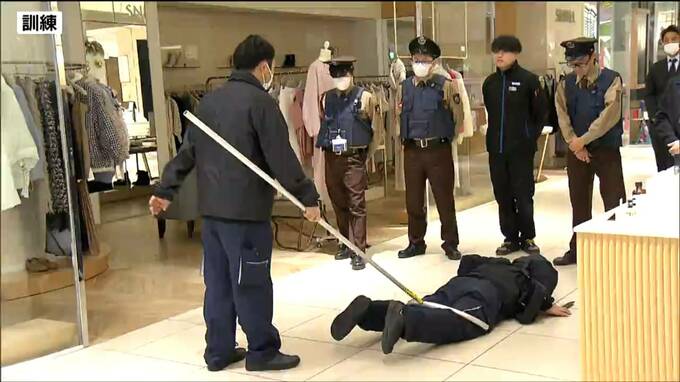 訓練の後には、警備員が警察からさすまたの使い方の指導を受けました。この訓練は他県の商業施設などで不審者が侵入する事件が相次いだことを受けて2019年から毎年行われていて、参加した警備員はいざという時の対応について改めて確認していました。