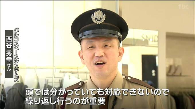 JR仙台駅前の仙台PARCOで行われた訓練は、刃物を持った2人組の男が施設に侵入し暴れたという想定で行われました。訓練では、警備員が警棒やさすまたを使って対応し、その後、男らは駆けつけた警察官によって取り押さえられました。