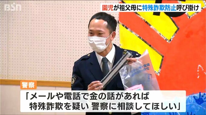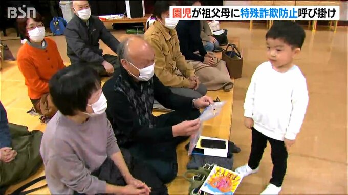 新潟県阿賀野市の園児が、参観日に訪れた祖父母に『特殊詐欺被害の防止』などを呼びかけました。