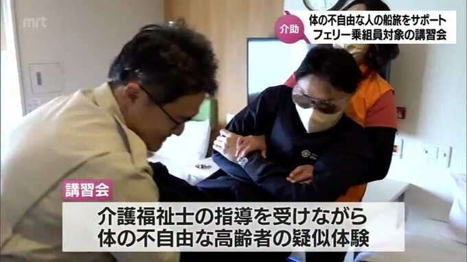 車いす利用者や体の不自由な高齢者の船旅をサポートしようと、フェリーの乗組員を対象にした講習会が宮崎市で開かれました。宮崎カーフェリーの「フェリーたかちほ」で行われた講習会には、乗組員らおよそ20人が参…