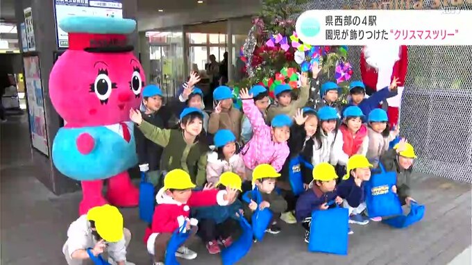 高知県四万十市の中村駅にやって来たのは東中筋保育所の年中と年長組の園児、21人。ミッションは、クリスマスツリーの飾り付けです。土佐くろしお鉄道では列車の利用客にクリスマスの雰囲気を感じてもらおうと毎年この時期、駅にクリスマスツリーを設置しています。園児たちはサンタさんに抱っこしてもらって高さ2.5メートルほどのモミの木のツリーに、色紙などで手作りした飾りを取り付けていきました。