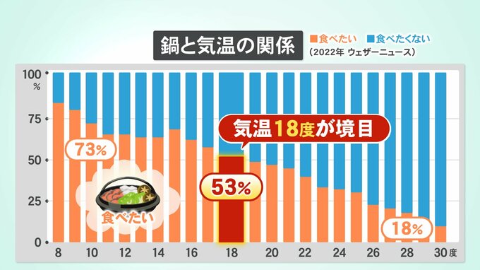 ウェザーニュースが去年、全国のおよそ2万5000人に行った「鍋と気温の関係」についての調査では、気温が18度を下回ると「鍋を食べたい」と答えた人が過半数を超えました。