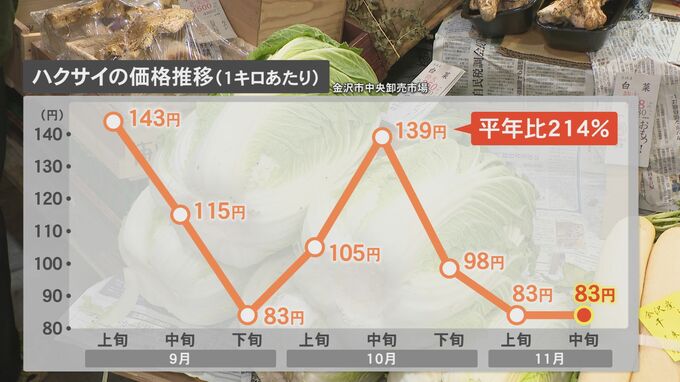 北陸農政局が公表している金沢中央卸売市場での価格推移を見ると、ハクサイは10月中旬に1キロ当たり平年の2倍以上の139円。