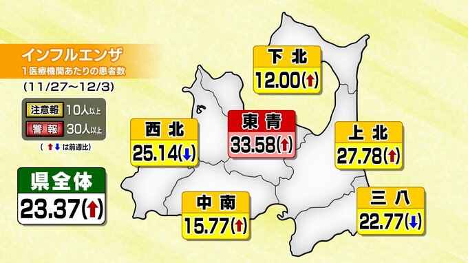 県は12月7日、インフルエンザ警報を東青地域に今シーズン初めて、発表しました。このほかの5つの地域は注意報となっています。県によりますと、今月3日までの1週間に指定医療機関から報告があったインフルエン…