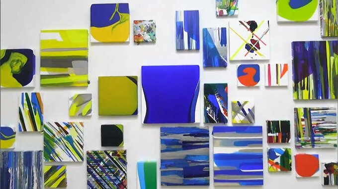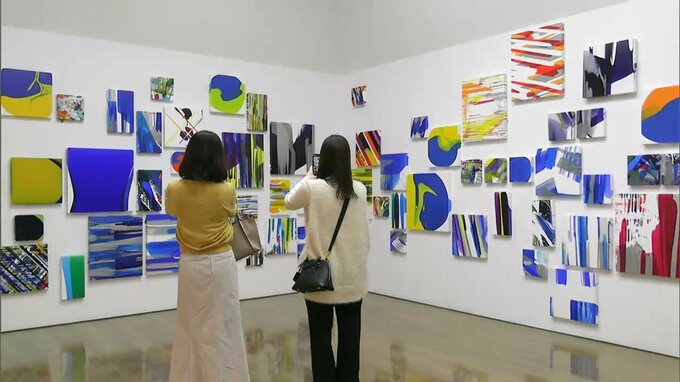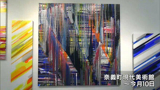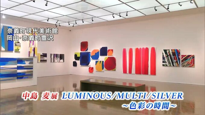 岡山県奈義町の美術館で、筆を使わず制作する色彩豊かな抽象画で知られるアーティスト中島麦さんの展覧会が行われています。