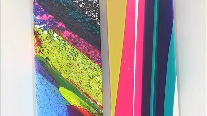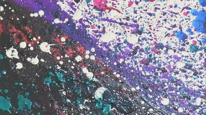 キャンバスに直接絵の具を流し込み、その動きをコントロールすることで様々な表情を生み出しています。