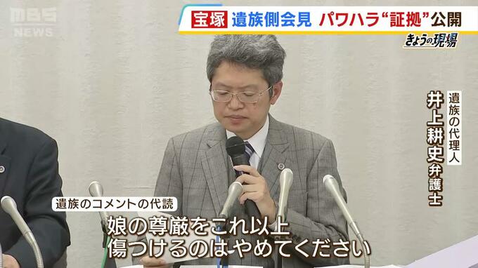 「娘と会えなくなってから2か月がたちました。今でも娘からのLINE、電話をそして帰ってくる足音を待ち続けています。その間に様々なことがありましたが、劇団がパワハラを一向に認めないことに憤りを感じています。劇団が依頼した弁護士による調査報告書には到底納得できません。宙組の生徒が勇気を出して証言してくださったこと、私たち家族の訴えをまったく認めず、上級生を擁護する歪曲した内容になっています。しかしながら調査報告書が認定している事実だけでも当該上級生の言動が、パワハラにあたります。何日も何時間も感情に任せて叱責され、すみませんでしたということしか許されず、泣きながら謝り続けている娘の姿を想像すると憤懣やるかたない思いです。娘はもう何もいうこともできません。それを良いことに自分たちに都合のいいように真実をすり替え、娘の尊厳をこれ以上傷つけるのはやめてください。私たち家族は劇団とパワハラを行った上級生が真実を認め謝罪することを求めます」