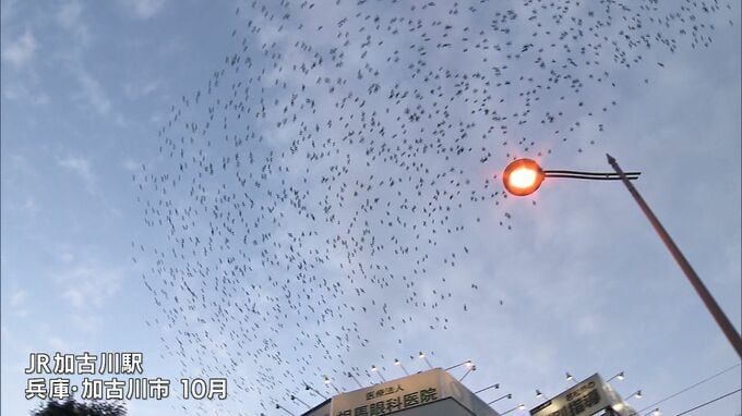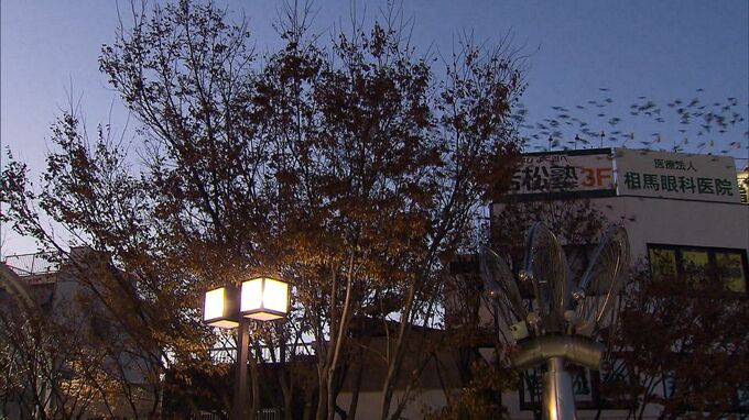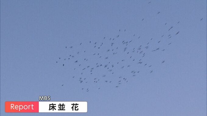 (MBS 床並花記者)「午後5時です。遠くの空をムクドリが飛び始めました。いつもとまっている木の近くを飛んではいるんですが、まだとまってはいないようです」