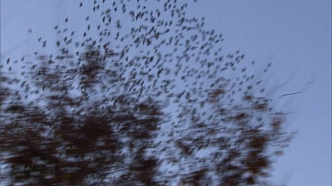 (MBS 床並花記者)「うわ、一気に…ムクドリが一気に木にとまり始めました」