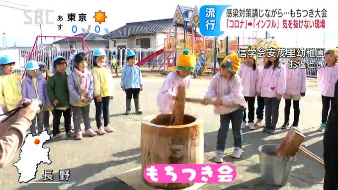 長野市の幼稚園で5日に行われた餅つき会では、68人の園児が順番に杵をもって、炊き立てのもち米をつきました。