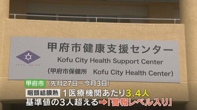 甲府市は7日、12月3日までの1週間で咽頭結膜熱の患者の数が1医療機関当たり3.4人と基準値の3人を超えたことから警報レベル入りを発表しました。