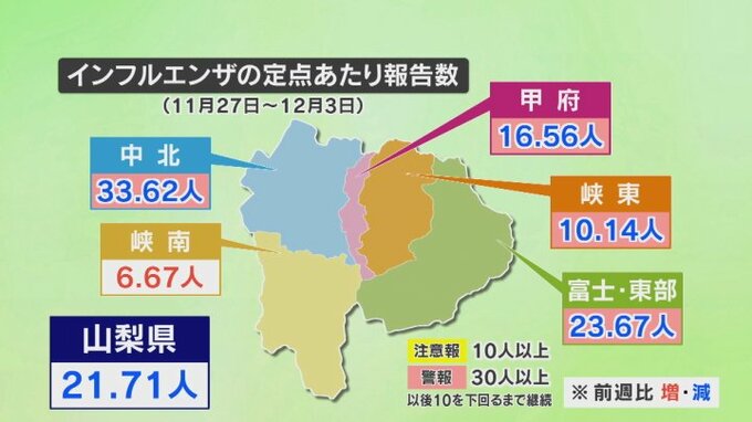流行中のインフルエンザは感染者数が減少し、山梨県では7週ぶりに1000人を切りました。