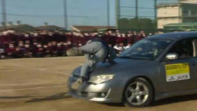 愛媛県西条市内の高校でスタントマンによる交通安全教室が開かれ通学などで自転車を利用する高校生が、事故の危険性を目と耳で学びました。丹原高校で開かれた教室では、まず、スタントマンが携帯電話を見なが…