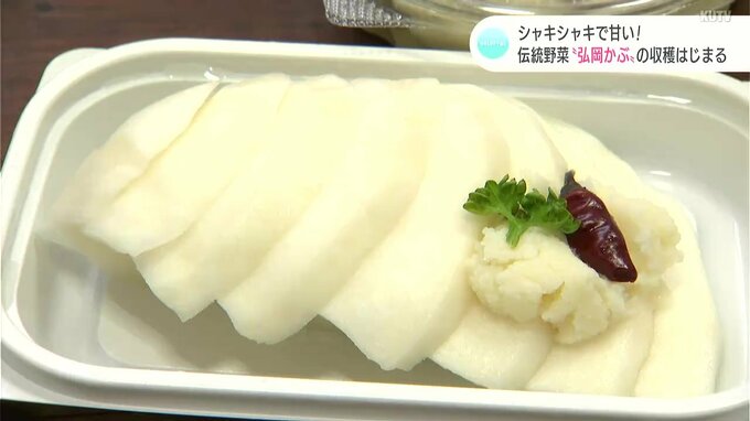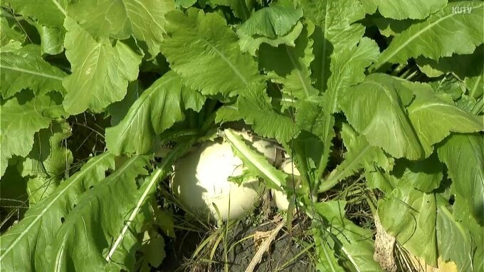 暖かさで実が大きくなり、寒さで実が増えるというカブ。弘岡地区は、水はけがよく昼夜の寒暖差も大きいため、カブの栽培に適していて、シャキシャキとした歯触りと、甘みを兼ね備えたおいしいカブが育つということです。寺田さんは「今年は台風の影響もなく順調に育ち、例年通りの出来だ」と話します。